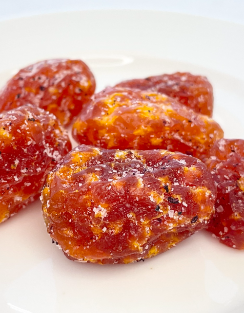 甘納豆風に仕上げた乾燥トマトに甘酸っぱい味わいのスッパイマンエキスパウダーをまぶしました。